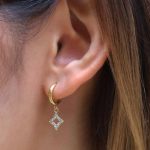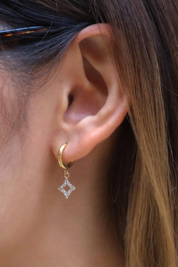 Chaque créole lisse accueille un pendentif en forme d’étoile allongée, délicatement ajourée et ornée de petits strass brillants. Leur forme élancée met en valeur le visage tout en restant légère et facile à porter.