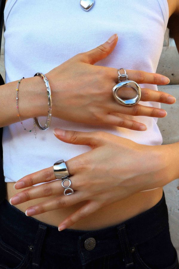 Cette bague argentée au design organique ondulé se distingue par sa forme ajourée irrégulière, rappelant une vague ou une goutte sculptée. Son style moderne et artistique en fait un bijou parfait pour celles qui aiment les pièces originales mais raffinées.