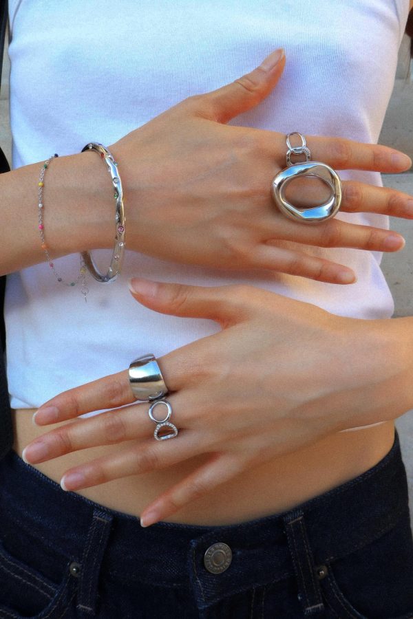 Ce bracelet argenté ouvert se distingue par son élégance moderne et son style discretement lumineux.
