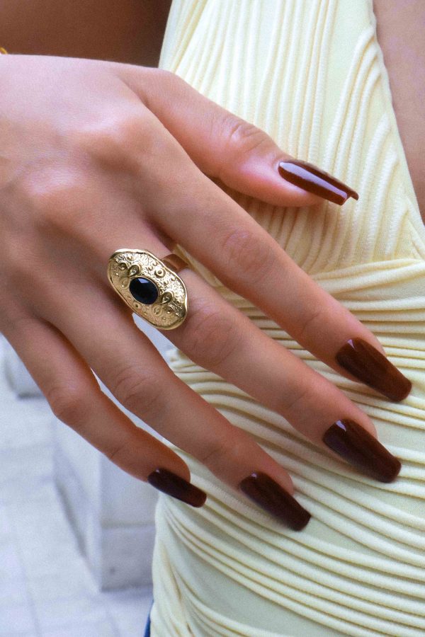 Cette bague dorée au style impérial et travaillé est ornée d’une magnifique pierre ovale noire, qui apporte profondeur et élégance. La plaque texturée qui encadre la pierre lui donne un caractère vintage et sophistiqué, parfait pour celles qui aiment les bijoux expressifs et raffinés.
