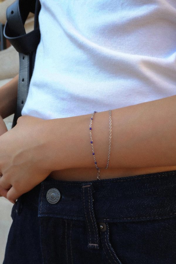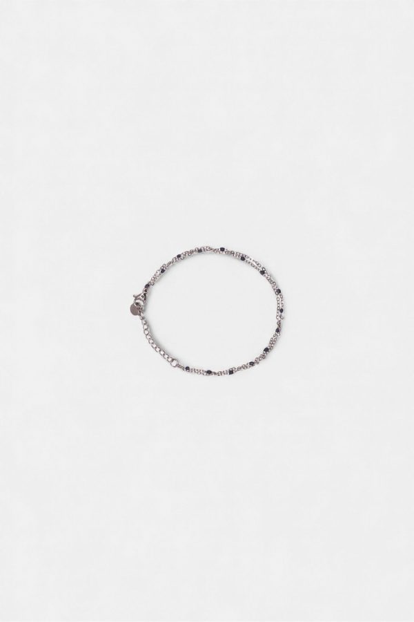 Sa chaînette fine est sublimée de petites perles noires régulièrement espacées, offrant un contraste délicat et moderne. Son design discret le rend idéal pour un port quotidien, seul ou associé à d’autres bracelets.