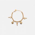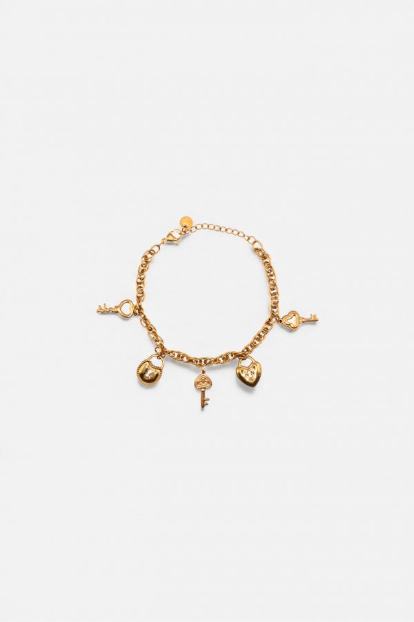 Le design associe une chaîne dorée brillante à des breloques détaillées : petites clés sculptées, cadenas cœur, et médaillon orné. Un bracelet qui représente l’amour, la protection et les secrets bien gardés.